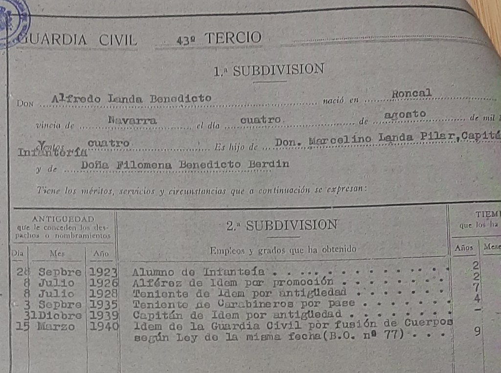 Durante algunos meses de 1940, el padre de Alfredo Landa ocupó el cargo de jefe accidental del puesto de la Guardia Civil de Figueras. El famoso actor, mientras tanto, se encontraba interno en un colegio de la orden de La Salle llamado «Els Fossos» donde aprendió a hablar muy bien catalán como aseguraría más adelante. Tenía por entonces siete años. Pero sigamos repasando los avatares del protagonista de esta historia que era su progenitor.