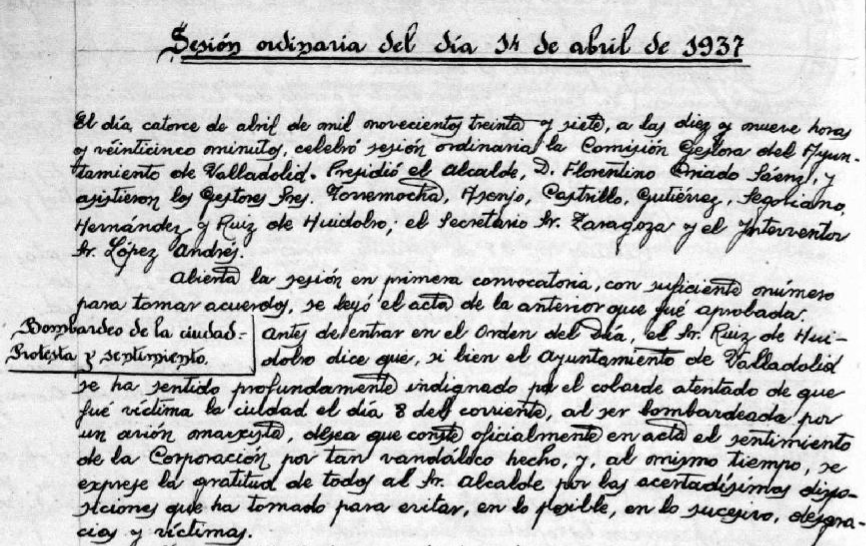 «En la mañana del 8 de abril, se presentó un avión sobre la ciudad de Valladolid. Llevaba la bandera nacional y volaba a escasa altura, evolucionando sobre la población, lo que pudo hacer a raíz de esa infame estratagema…Cuando los transeúntes y el público lo contemplaba sin cuidado alguno, el avión, que resultó ser enemigo, lanzó en un brevísimo espacio siete bombas las cuales produjeron graves desperfectos, treinta muertos y más de cien heridos…De los muertos aproximadamente la mitad eran niños que salían de la escuela».