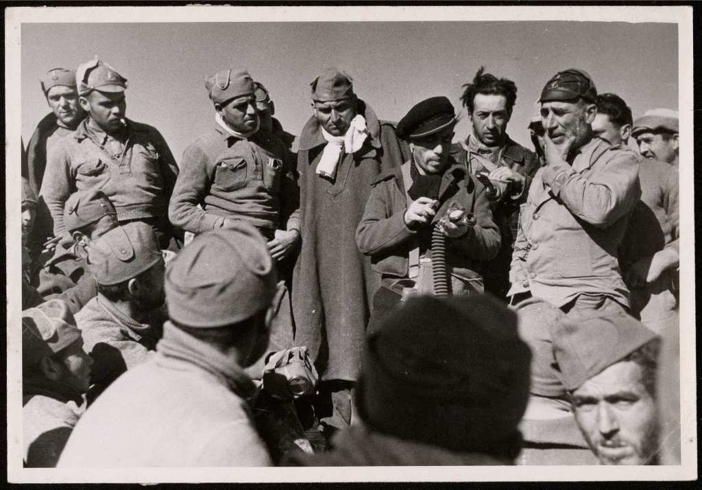 Esta imagen no corresponde directamente con la Batalla del Jarama, pero sí que tiene que ver con ella, indirectamente. En el centro de la imagen (de 1938) podéis ver a Joaquín García- Morato, el as de la aviación nacional, celebrando con varios efectivos de su escuadrilla la concesión de la Cruz Laureada de San Fernando a título individual. Su actuación durante la Batalla del Jarama le sirvió para obtener esta importantísima distinción militar.