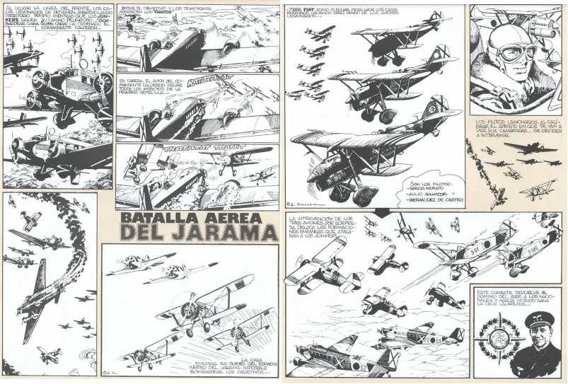 En los años que llevamos investigando la Guerra Civil nos hemos topado con varios comic relacionados con la Guerra Civil española, sin embargo, la mayoría de ellos no pertenecen a publicaciones españoles sino extranjeras. La imagen que veis es una excepción. La revista militar (editada por el Ejército del Aire) AEROPLANO, publicó en los años ochenta un especial sobre la Batalla del Jarama. Este especial recogía unas tres páginas con viñetas sobre los combates aéreos que se libraron en los cielos de Morata de Tajuña, San Martín de la Vega o Rivas Vaciamadrid.