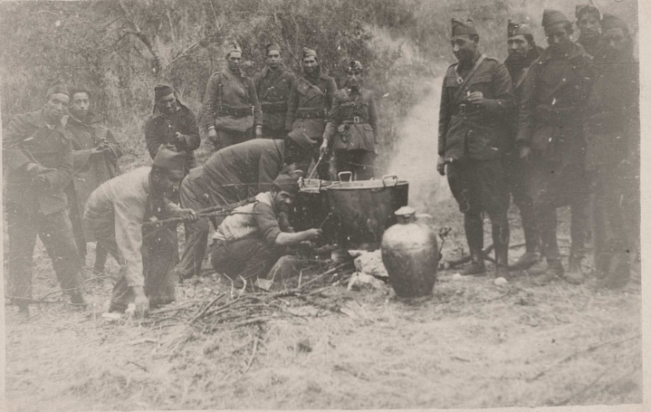 En esta foto se aprecia como una quincena de efectivos se aproxima a un caldero de grandes dimensiones antes del racho, posiblemente también para resguardarse del frío. Todos los hombres que aparecen en la imagen miran al caldero de manera relajada, como si guerra estuviera a cientos de kilómetros de allí.