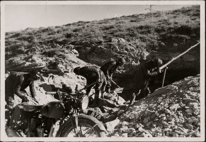 Lo confieso, tenemos predilección por esta imagen. En ella se aprecia a integrantes de la Brigada Motorizada construyendo un refugio para ametralladoras en el frente del Jarama. Los miembros de esta unidad republicana son perfectamente reconocibles con su atuendo: prendas de cuero y casco de motoristas.