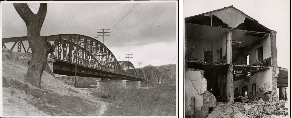 Como antes decíamos, en la Guerra Civil el Puente de Arganda sufrió un elevado número de ataques aéreos, bombarderos de artillería y batallas cuerpo a cuerpo de la infantería. El 8 de febrero de 1937, la caballería sublevada consiguió cruzar el puente y durante el golpe de Casado (marzo de 1939), las unidades franquistas que lo guarecían no atacaron a los efectivos republicanos del Ejército de Levante que acudieron hasta Madrid para apoyar al coronel republicano. En otra imagen que podéis ver, se aprecia un edificio que se encontraba ubicado a muy pocos metros del puente de Arganda y que sufrió las consecuencias de un bombardeo.