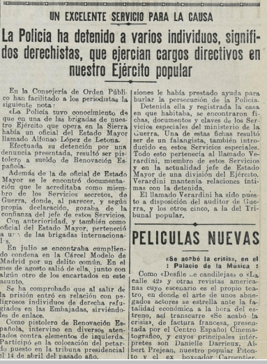 Cuatro meses después de los sucesos de la Embajada de Siam, López de Letona fue detenido por las autoridades republicanas. Por esas fechas, había abandonado Madrid y se había enrolado en el frente de la sierra como «oficial de Estado Mayor» de las Brigadas Internacionales. En esa ocasión, su arresto corrió a cargo de la Policía que en una nota de prensa aseguró que nuestro hombre, antes de la guerra, había sido «pistolero» de Renovación Española. Esa nota de prensa también decía que entre los documentos que le requisaron había algunos que le «acreditaban como miembro de los servicios secretos del Ministerio de la Guerra, donde al parecer y según su propia declaración, gozaba de la confianza del jefe de estos servicios. Los periódicos dijeron abiertamente que fue «un tal Verardini» el que le facilitó los documentos de los Servicios Especiales y de la CNT que llevaba consigo cuando fue arrestado.