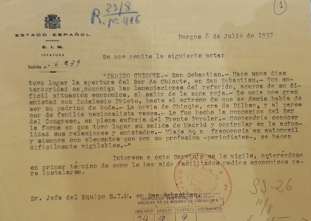 Casi dos meses después de aquella petición desde Burgos, el SIM de San Sebastián envió un pequeño informe donde contestaban a alguna de las preguntas que se habían formulado semanas atrás. El informe está fechado el 23 de agosto de 1937 y hablaba, en primer lugar, de la llegada de Chicote a zona nacional. Se explicaba que el inicio de la Guerra Civil le sorprendió en Londres donde solía acudir todos los veranos. Allí estuvo “actuando en favor de la causa nacional” junto con el Marqués de Portago cuya vida y contactos en Reino Unido estaban muy asentados. Después, “entró en nuestra zona, montando el Bar Chicote” para lo cual, le dieron facilidades y crédito los bancos de aquí, pues en la plaza de Madrid tenía cuentas en valores del Estado”.