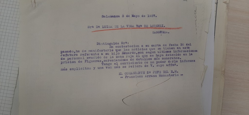 “Muy señor mío. Perdone que le moleste y le quite unos minutos de su tiempo, pero sabrá disculparme cuando se entere de mi situación. Soy viuda con tres hijos. Dos están en el frente. El mayor es capitán de Infantería y está de observador volando por los aeródromos de nuestra España blanca. Un segundo hijo es teniente de Aviación con destino en Getafe, en caza y completamente de derechas. No sé nada de él desde que el empezó el movimiento. Hace unos días, a mi hijo mayor le dijeron unos evadidos de Madrid que mi hijo, que se llama Eduardo Lorenzi de la Vega, está detenido hace mucho tiempo en Figueras. Yo desearía si podrían averiguar si esto es cierto o que me digan lo que sepan de mi hijo por triste y duro que sea. Todo es preferible a esta incertidumbre en que vivo. Dándole las gracias anticipada, quedo a la espera de su respuesta. Luisa de la Vega, viuda de Lorenzi. Sanguesa (Navarra), calle Alfonso Batallador 16”.