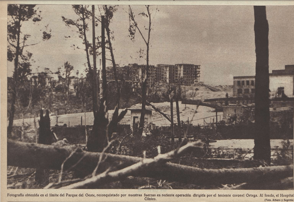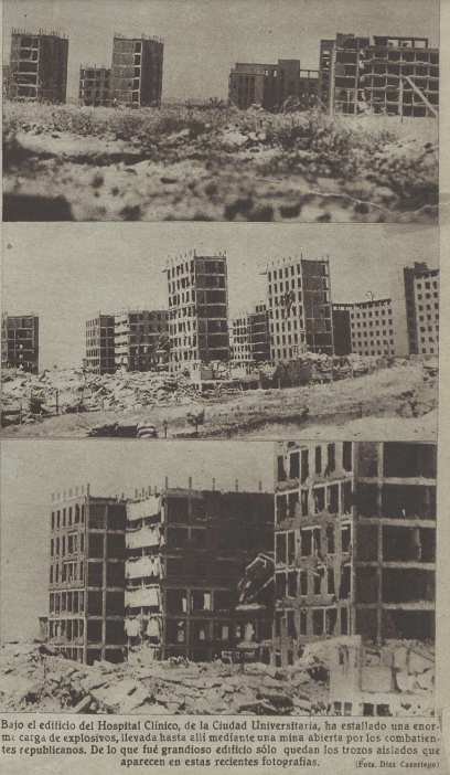 La lucha en el interior del hospital se libró hasta el 30 de noviembre de 1936. A partir de ese día y hasta el final de la guerra podemos decir que el Clínico se convirtió en una posición exclusivamente nacional, la más próxima al interior de la ciudad de Madrid. Su elevación por encima del resto de edificios de la zona propició que fuera atacada constantemente por la artillería republicana, lo que convirtió el futuro hospital en una especie de queso gruyere, por la gran cantidad de impactos que había recibido su fachada. Hemos creado una galería de imágenes con la visión que tenían las fuerzas republicanas del Clínico durante toda la Guerra Civil según aparecía publicado en la prensa madrileña.