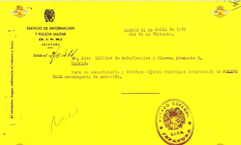 Durante su proceso judicial, la Sección de Información de la Región Aérea del Centro también elaboró un completo informe sobre el sargento Sanz donde se hablaba de su brillante actuación como miembro de la Quinta Columna. Un informe que contrastaba con el que elaboró el SIPM (Servicio de Información y Policía Militar) donde se vinculaba a Felipe con el posible asesinato en la guerra del oficial de Aviación retirado, Pedro Martín.