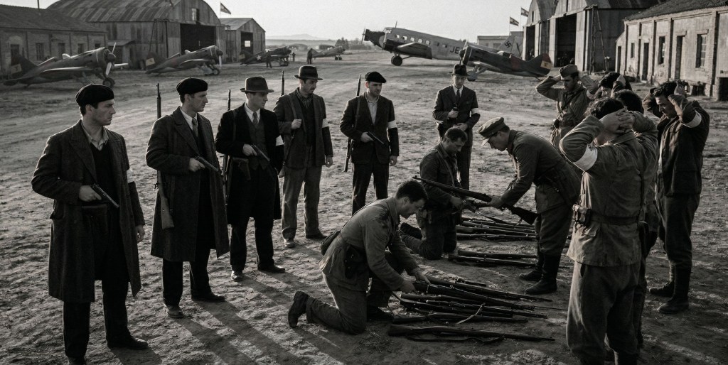 28 de marzo de 1939. Son las diez de la mañana. Quedan pocas horas para que termine la Guerra Civil en la ciudad de Madrid. Dos coches llegan hasta las puertas del aeródromo de Barajas y descienden de ellos una docena de hombres armados con pistolas y fusiles. Todos ellos visten de civil con brazaletes de color blanco salvo uno que luce el uniforme de teniente de Aviación. El oficial se presenta ante los guardias republicanos como uno de los responsables del grupo de la Quinta Columna que tiene órdenes directas de hacerse con el control de las oficinas militares, del pequeño arsenal y las pistas de despegue y aterrizaje. Les ordena que arrojen al suelo todo su armamento y que colaboren en la operación de traspaso de poderes si no quieren tener problemas con la España de Franco.